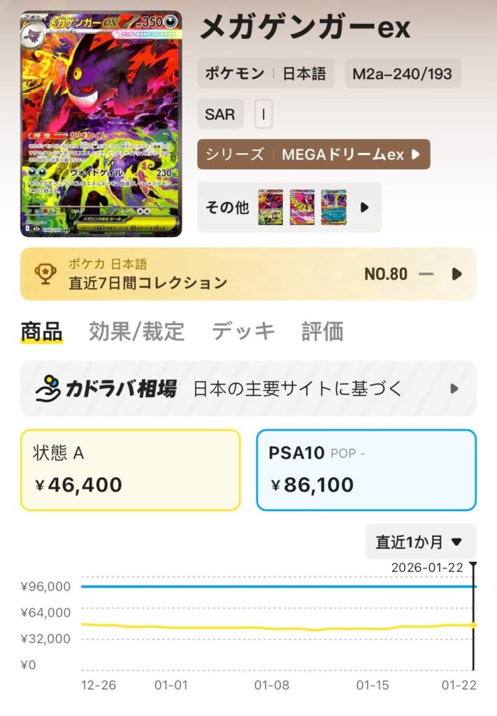 カドラバの相場推移機能を使えば、PSA10個別の価格変動をリアルタイムで追跡可能です。カドラバ 投資ツールを駆使し、冷静に市場と向き合う準備はできているでしょうか。